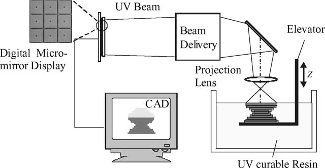 Micro-stereo lithography is used for the microfabrication of three-dimensional structures, which in simple terms is 3D printing. The software splits the 3D model into a series of bitmaps in cross-section. The DMD is then controlled to generate the corresponding dynamic digital masks based on the bitmap of each layer. Light is projected through the mask onto the surface of the liquid resin, which is light-cured to form a shape of a certain thickness. Shape of the bitmaps figure can be completed one by one, and then the entire 3D structure is created. Nowadays, it is possible to process 0.6μm lines using micro-stereo lithography.7