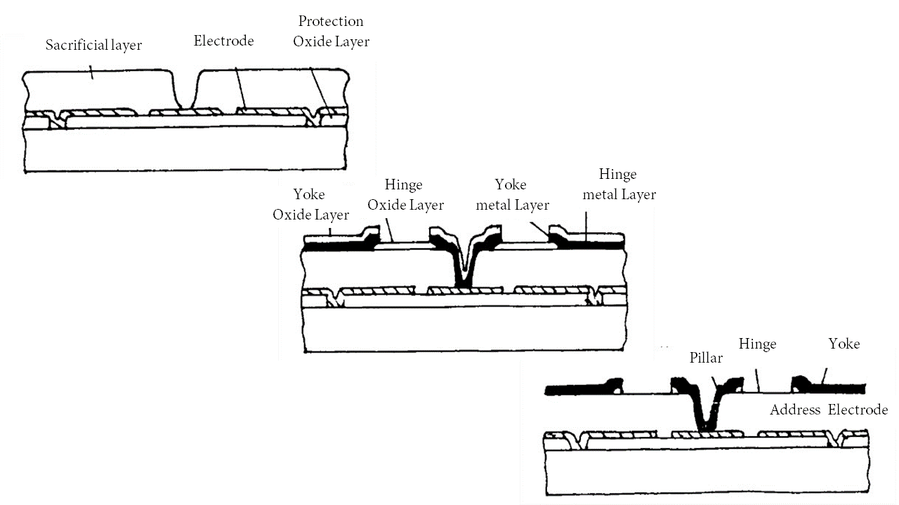 CMOS SRAM as the base of the entire DMD unit is at the lowest level. On the substrate is a metal layer used as electrodes. There are two types of electrodes: reset electrode and address electrode. The reset electrode is connected to hinge. The two address electrodes are respectively distributed in two directions of mirror deflection. The top layer is the mechanical structure part of DMD, which is composed of Hinge, Yoke and Mirror. The mirror is fixed on the yoke. The hinge fixed on the pillar can drive the yoke to rotate, and then make the reflector to deflect.