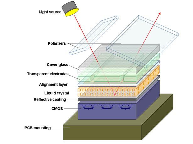 LCoS device is very similar to LCD device. The LCD directly uses the molecular properties of the liquid crystal to control the spatial light that passes through it. But LCoS is different from it. LCoS uses a single piece of CMOS as a substrate which is smoothed and coated with aluminum as a reflector. The liquid crystal is injected and packaged between the CMOS substrate and the glass substrate. In use, the light source is injected from outside, passes through the liquid crystal, and is reflected by the CMOS reflector. Spatial light is processed by a CMOS-controlled liquid crystal. Therefore LCoS is a reflective device.