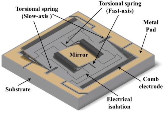 MEMS scanning mirrors control light by reflecting specific light into specific locations, as does DMD. However, MEMS scanners are not controlled in the same way in microscopes, which are magnetically controlled by electrodes from both horizontal and vertical directions. Therefore, the deflection angle of the MEMS scanning mirror is controlled and the degree of freedom is two-dimensional.