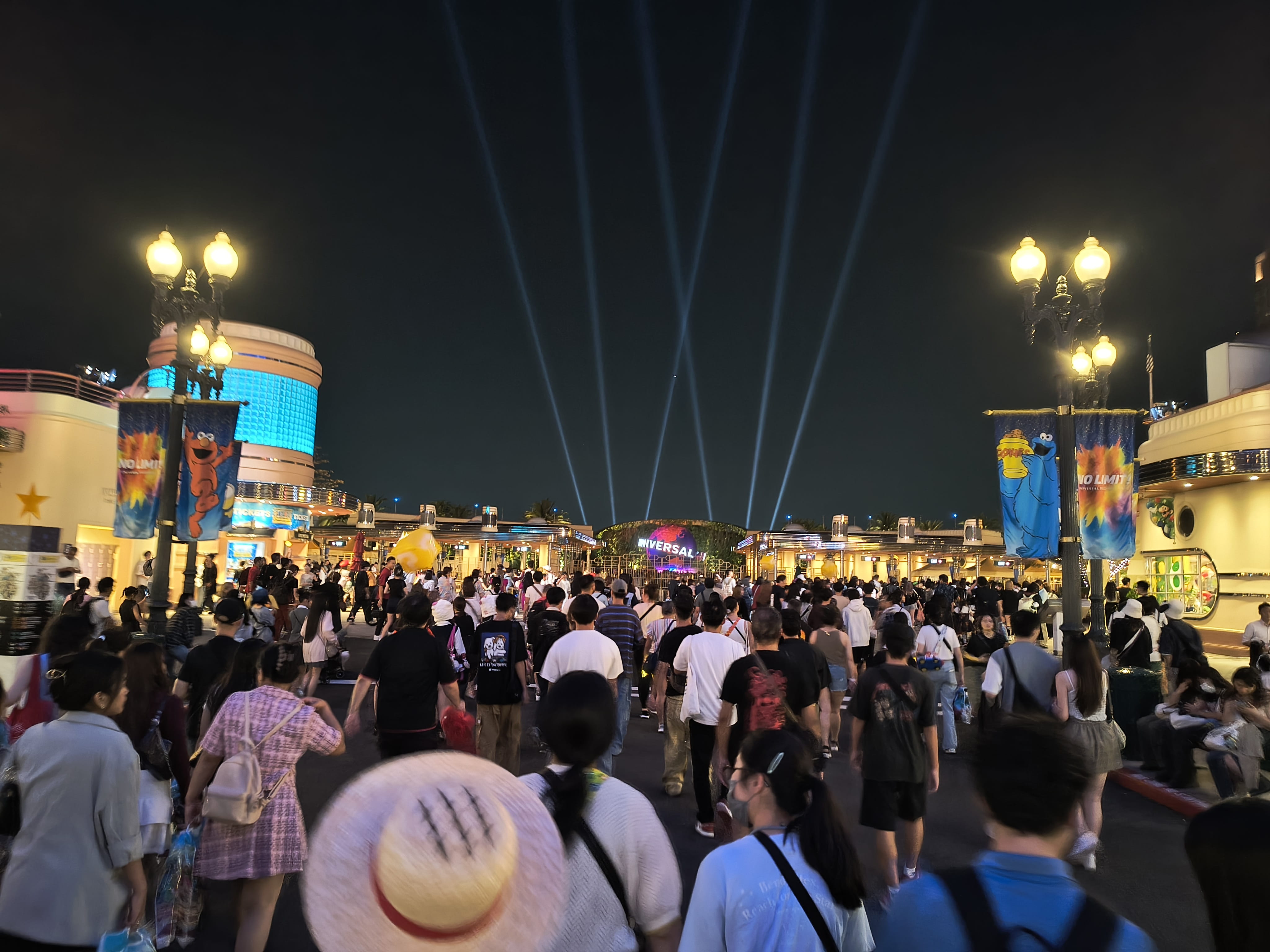 大门外的夜色下,环球影视的巨大地球 Logo 还在缓缓转动。